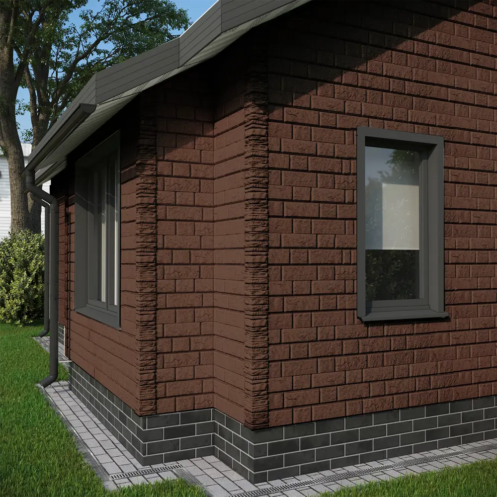 Благодаря глубокой офсетной печати по горячей поверхности панели сайдинга не тускнеют и не выгорают на солнце, сохраняя красивый натуральный тон и естественный древесный рисунок. Для облицовки фасада в единой эстетике используйте углы и профили в цвете «Яблоня».