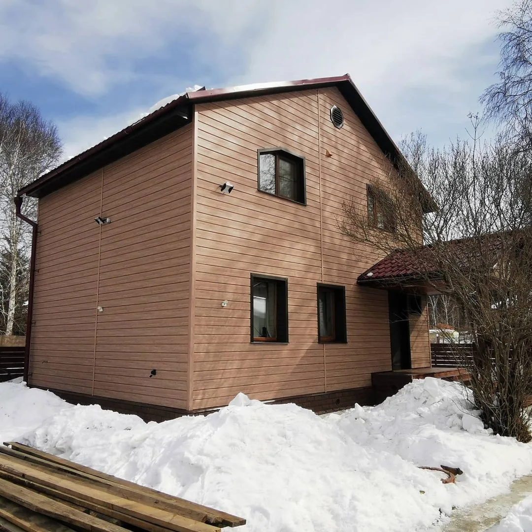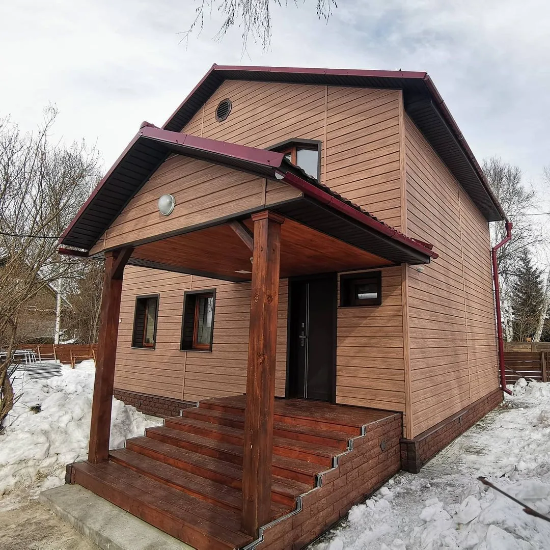 Благодаря глубокой офсетной печати по горячей поверхности панели сайдинга не тускнеют и не выгорают на солнце, сохраняя красивый натуральный тон и естественный древесный рисунок. Для облицовки фасада в единой эстетике используйте углы и профили в цвете «Яблоня».