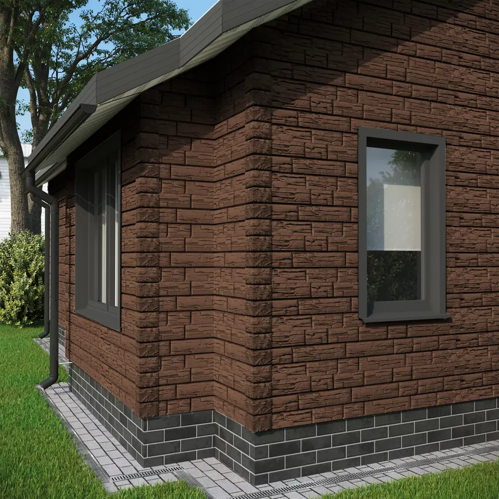 Благодаря глубокой офсетной печати по горячей поверхности панели сайдинга не тускнеют и не выгорают на солнце, сохраняя красивый натуральный тон и естественный древесный рисунок. Для облицовки фасада в единой эстетике используйте углы и профили в цвете «Яблоня».