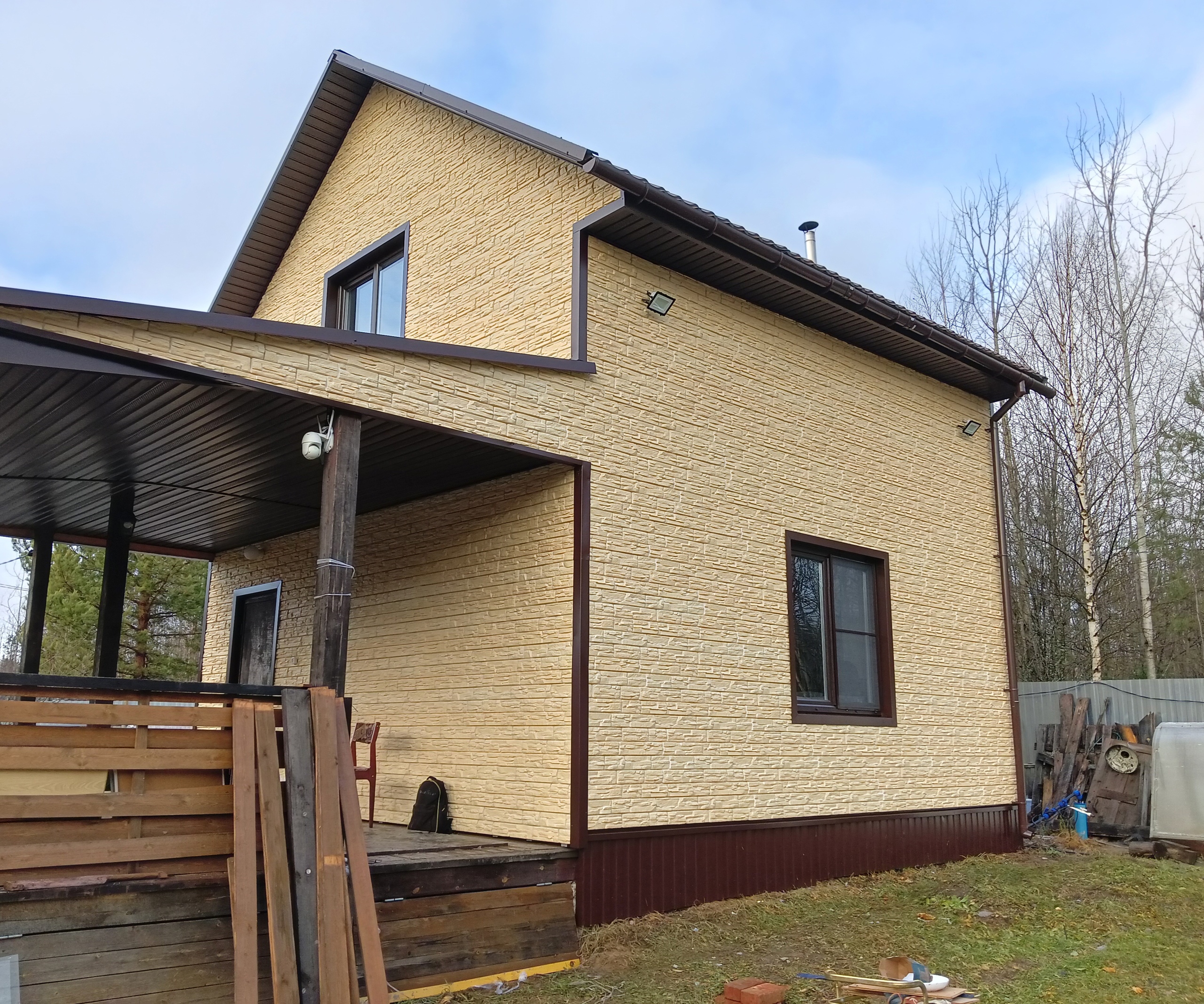 Благодаря глубокой офсетной печати по горячей поверхности панели сайдинга не тускнеют и не выгорают на солнце, сохраняя красивый натуральный тон и естественный древесный рисунок. Для облицовки фасада в единой эстетике используйте углы и профили в цвете «Яблоня».