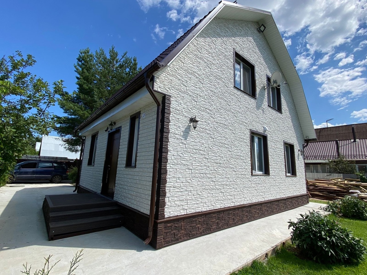 Благодаря глубокой офсетной печати по горячей поверхности панели сайдинга не тускнеют и не выгорают на солнце, сохраняя красивый натуральный тон и естественный древесный рисунок. Для облицовки фасада в единой эстетике используйте углы и профили в цвете «Яблоня».