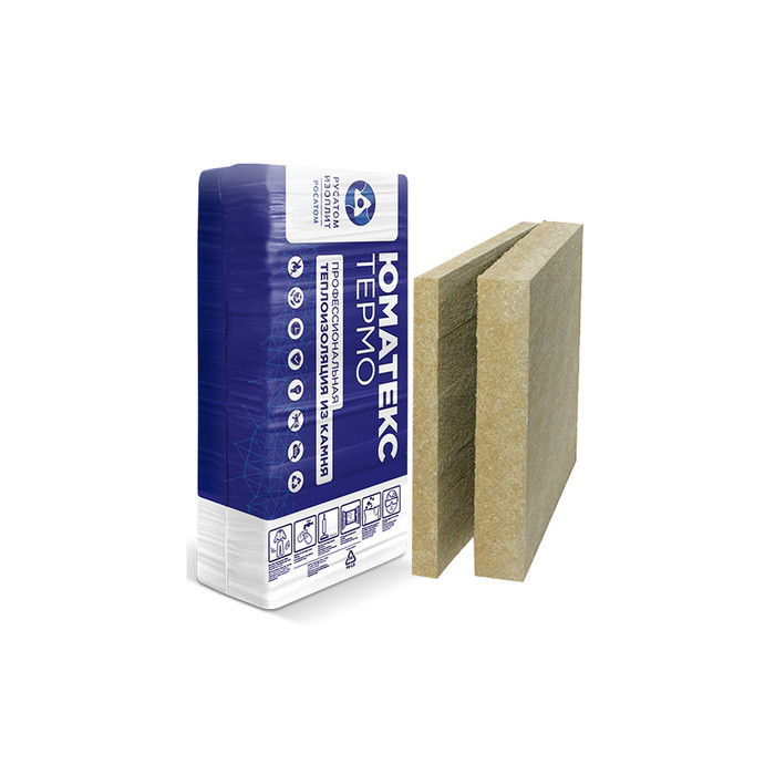 ЮМАТЕКС ТЕРМО – негорючая каменная вата с покрытием из стеклохолста белого цвета. Применяется в качестве несущего нагрузку теплоизоляционного слоя для плоских кровель в процессе реконструкции старых и строительства новых зданий. Пригодна для больших несущих нагрузок.